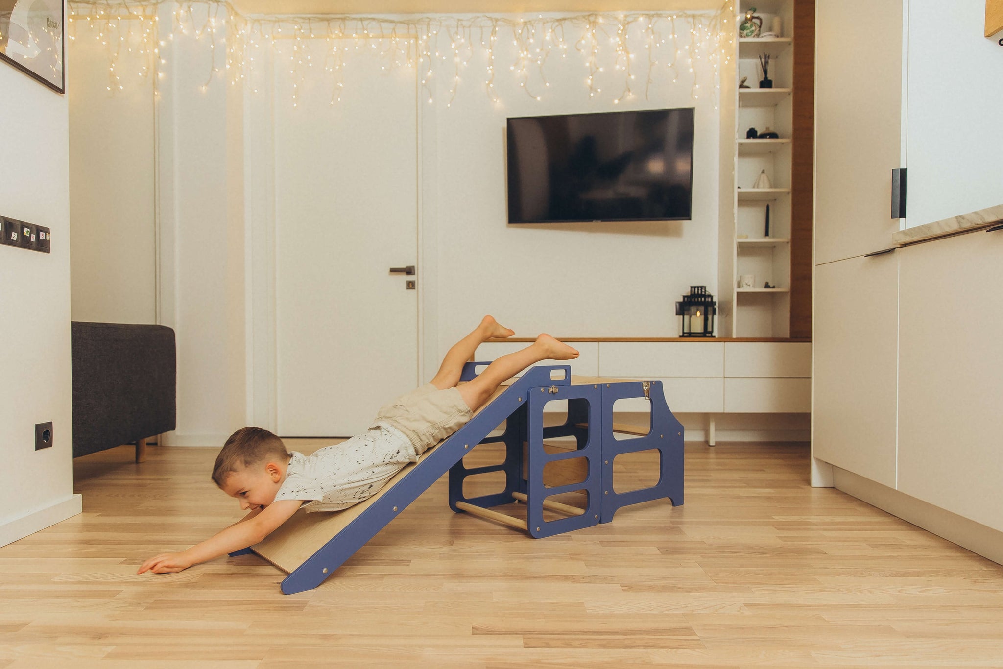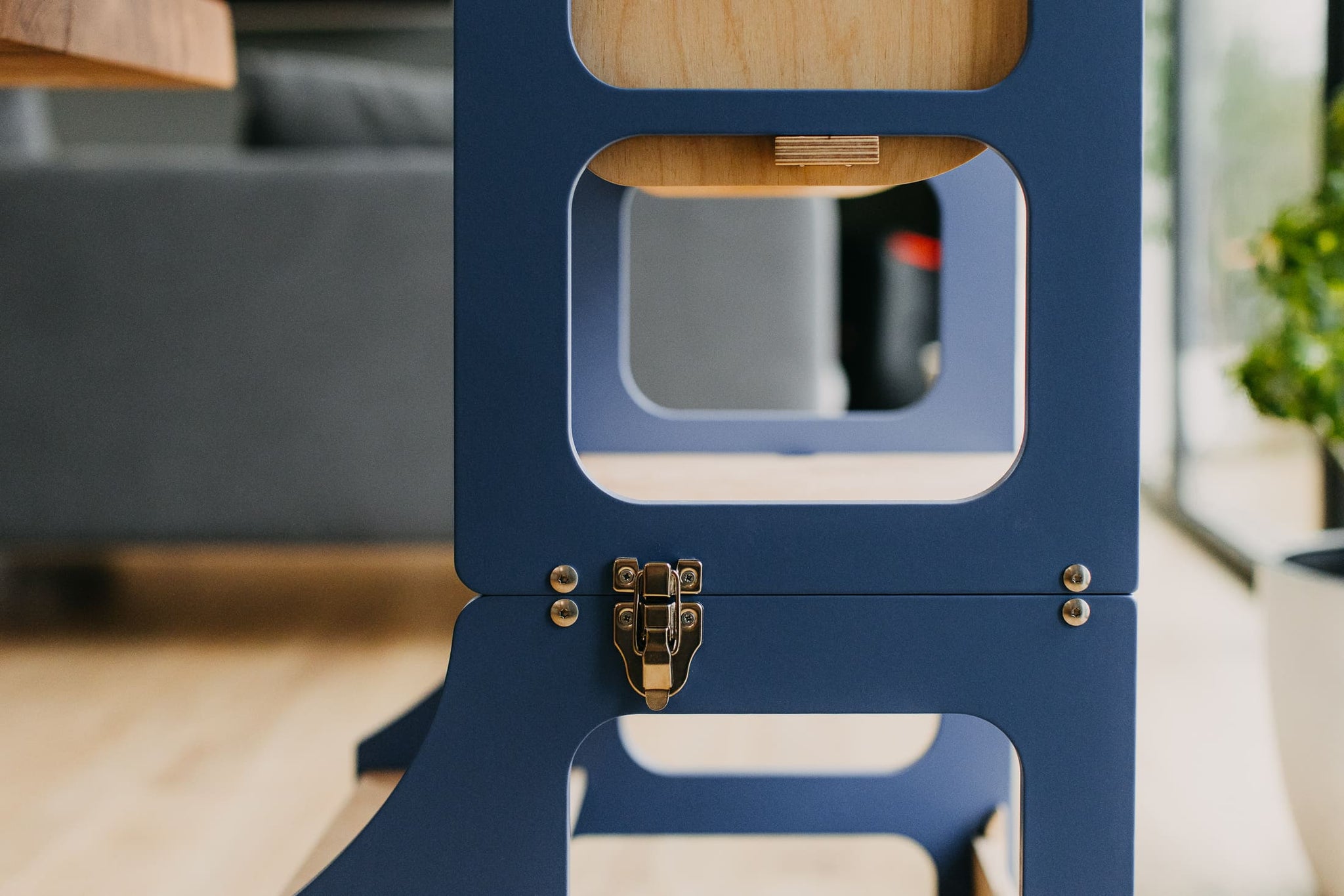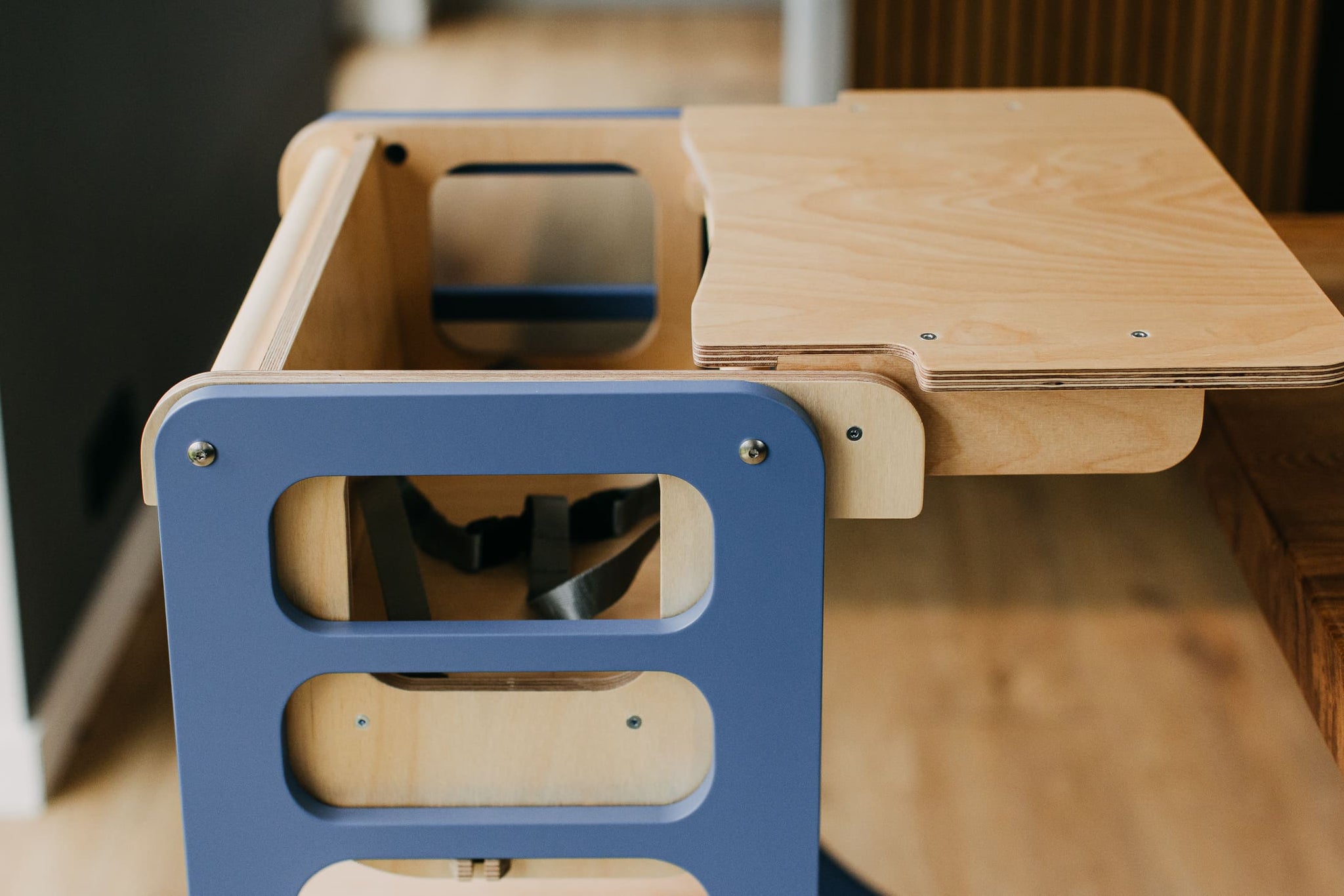 Denne Kjøkkenhjelperen 4 i 1 BLUE er utstyrt med en ekstra flat planke i nedre del for å sikre enda bedre stabilitet og forhindre velting. I tillegg er det inkludert en sikkerhetssele som alltid skal brukes når babyen sitter i stolen under måltidet.