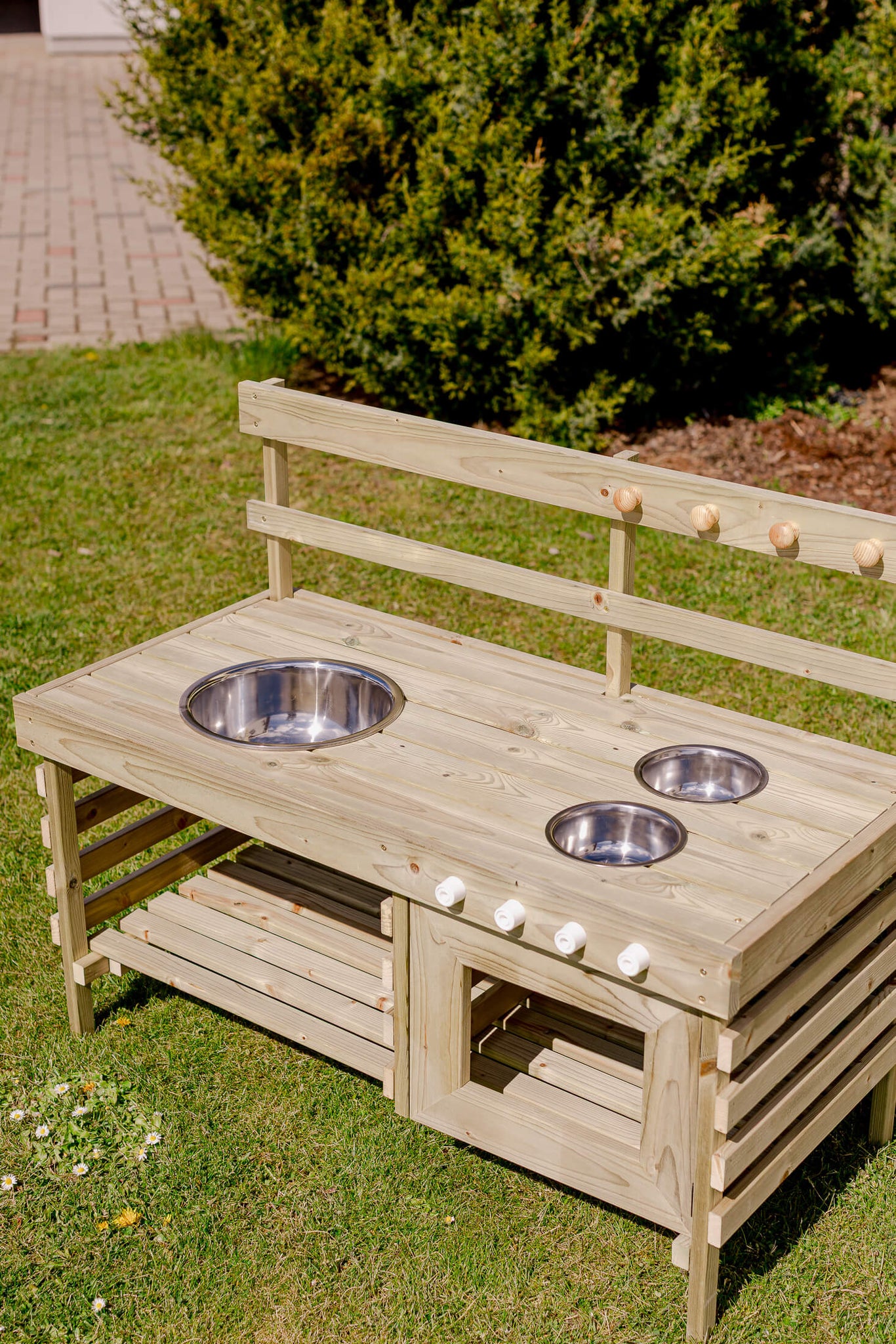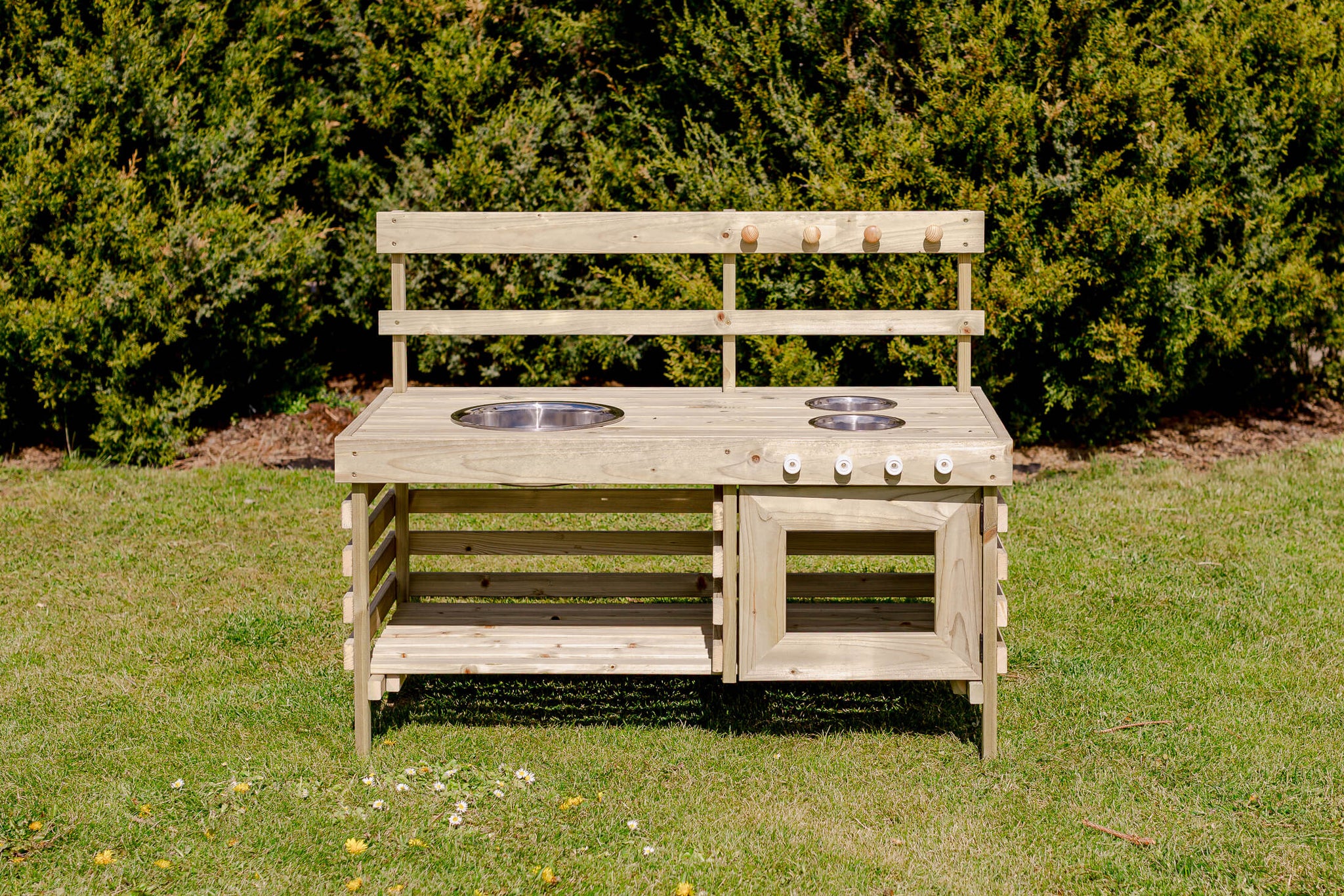 Mud kitchen XL er et stor utekjøkken lekekjøkken for utendørs bruk. Solid utekjøkken i tre for bruk i hagen eller på terrassen din.