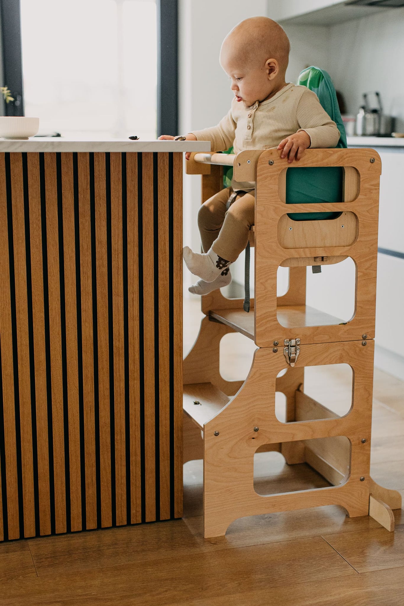 Fleksible bruksområder: når barnet er ferdig med måltidet, kan babybordet enkelt fjernes, og stolen forvandles til en læringstårn eller barnebord med benk som gir timevis med lek og moro. I tillegg kan den baby sittedelen brukes som en krakk for eldre barn eller voksne når Kjøkkenhjelperen brukes i sittende posisjon.