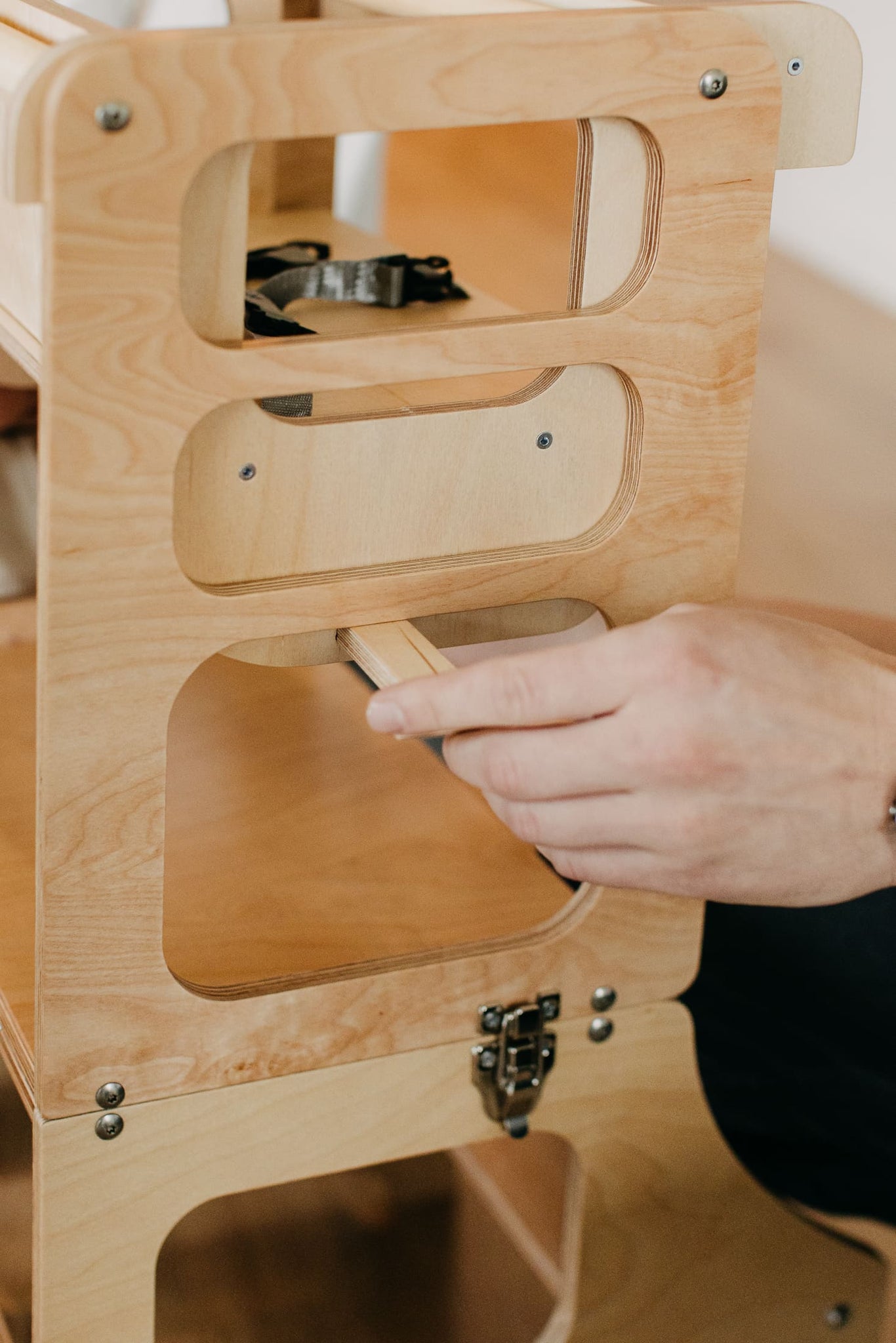 Denne Kjøkkenhjelperen 4 i 1 NATURE i bjørk tre er utstyrt med en ekstra flat planke i nedre del for å sikre enda bedre stabilitet og forhindre velting. I tillegg er det inkludert en sikkerhetssele som alltid skal brukes når babyen sitter i stolen under måltidet.